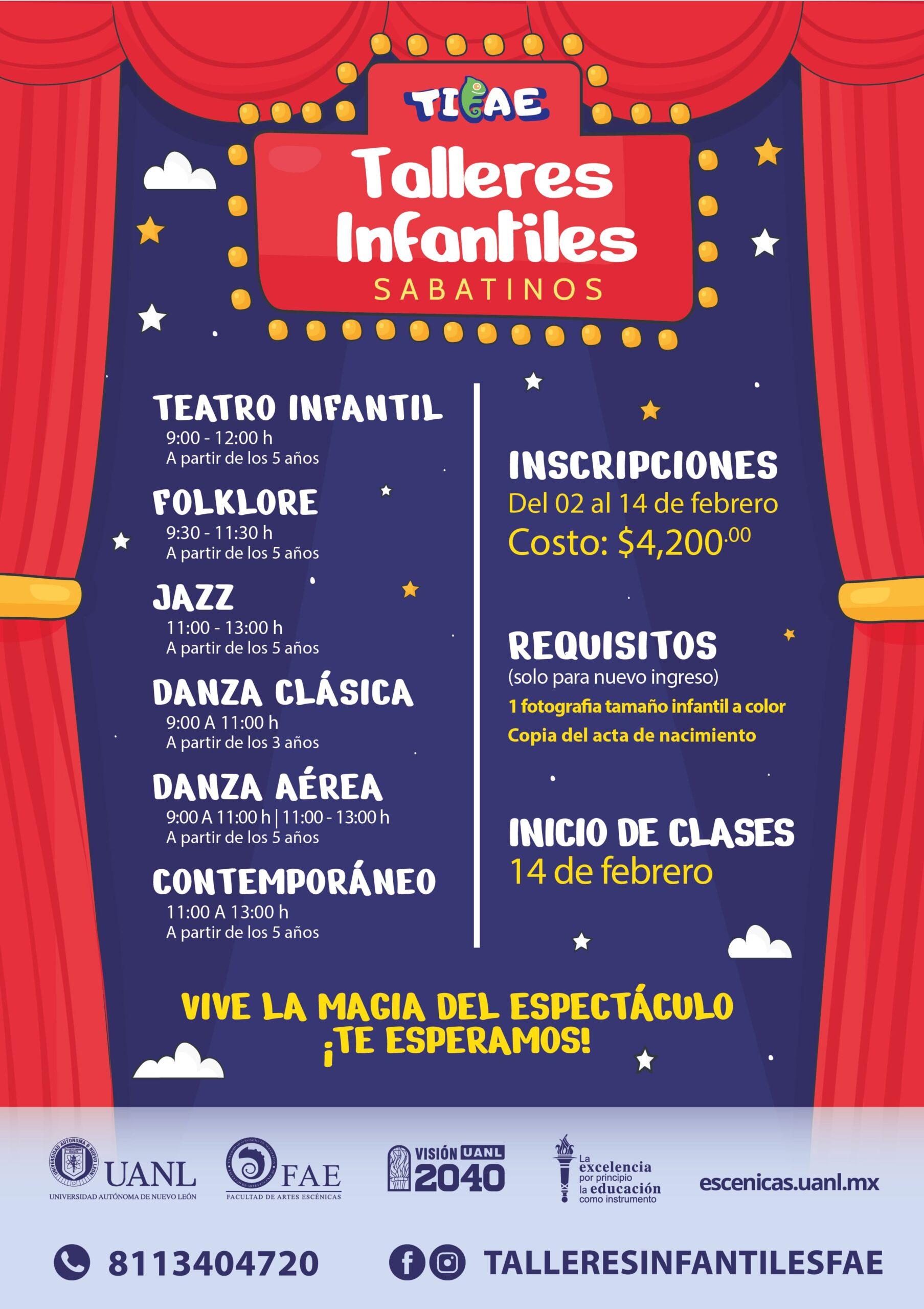 Los Talleres Infantiles de la Facultad de Artes Escénicas de la Universidad Autónoma de Nuevo León son y han sido desde hace más de 30 años una opción para todos los niños que tienen esa inquietud por las artes escénicas, brindando a sus alumnos una inducción de calidad enfocada a enseñar, disciplinar, sensibilizar y acercarlos a este bello arte, formando y desarrollando poco apoco pequeños artistas.  Estos talleres surgen de esa necesidad, es por eso que nuestra misión principal es inculcar y resaltar los valores culturales y artísticos de todos nuestros alumnos.